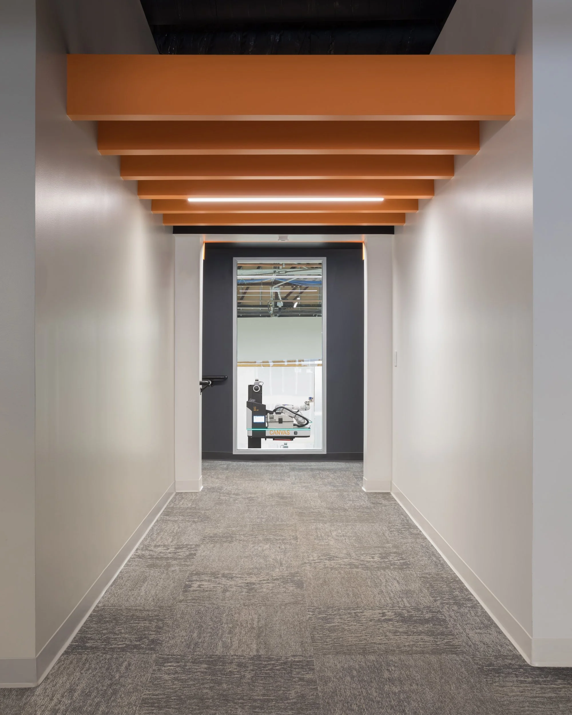 The resulting set included wide views of larger interiors along with tighter compositions that highlight Rae + Heath’s careful use of tone, texture, and graphic detail. One of my favorite frames looks down a hallway with a floor-to-ceiling window that overlooks Canvas’s massive workshop space. Through the glass, you can see one of their drywall finishing robots in action — a reminder of the company’s innovative role in construction technology.